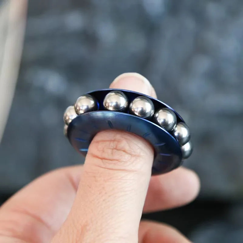 Designed with a precision-machined **aluminum alloy body** and **stainless steel ball bearings**, this ring-style fidget spinner delivers a unique combination of smooth rolling motion and ratcheting haptic feedback. Slide your fingers along the outer ring and feel the steel balls glide and click around the track—calming, grounding, and seriously addictive.